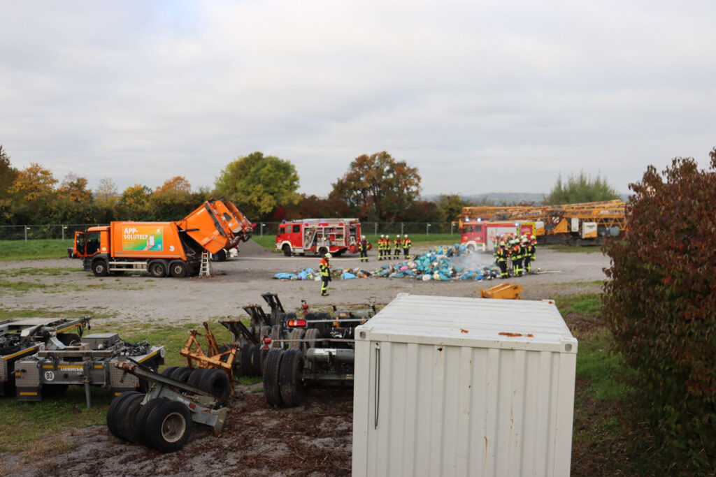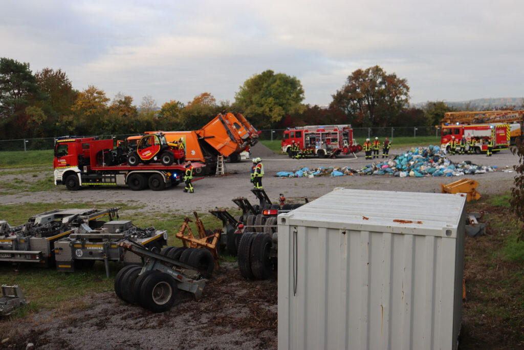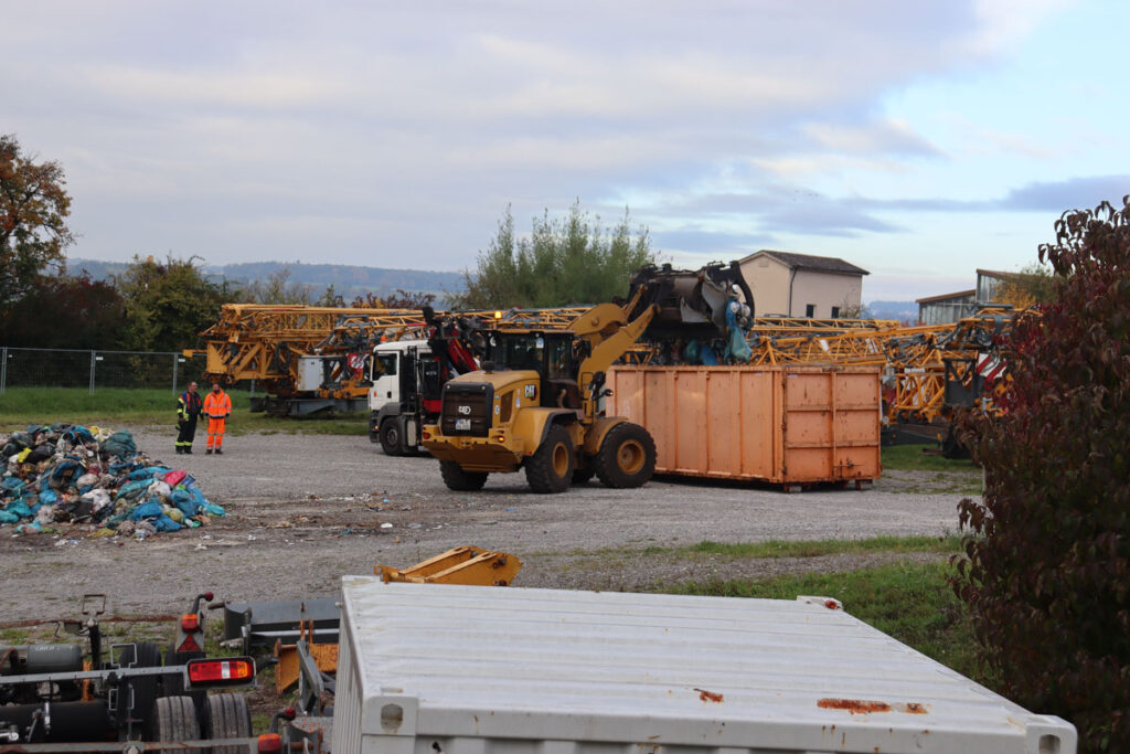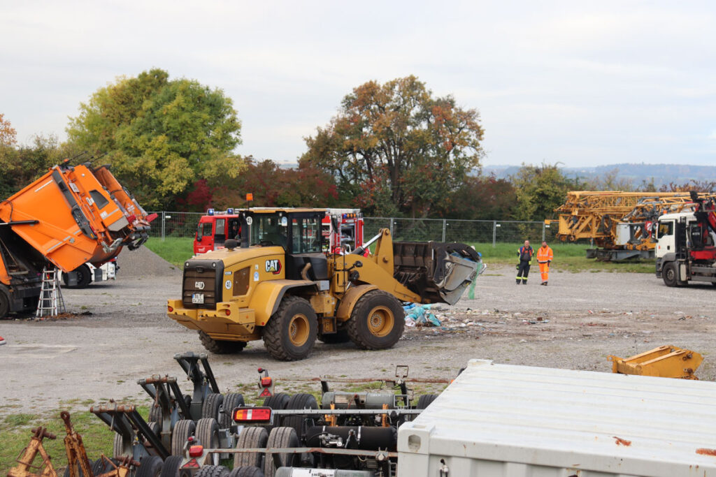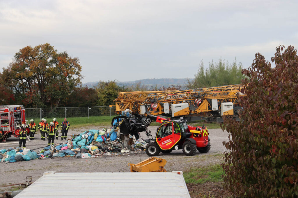 Ein ebenfalls hinzugezogener Bagger unterstützte im Anschluss die Aufräumarbeiten, indem er das abgelöschte Brandgut in einen bereitstehenden Container verlud.