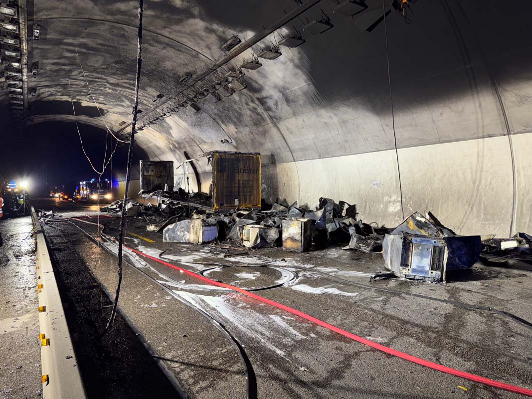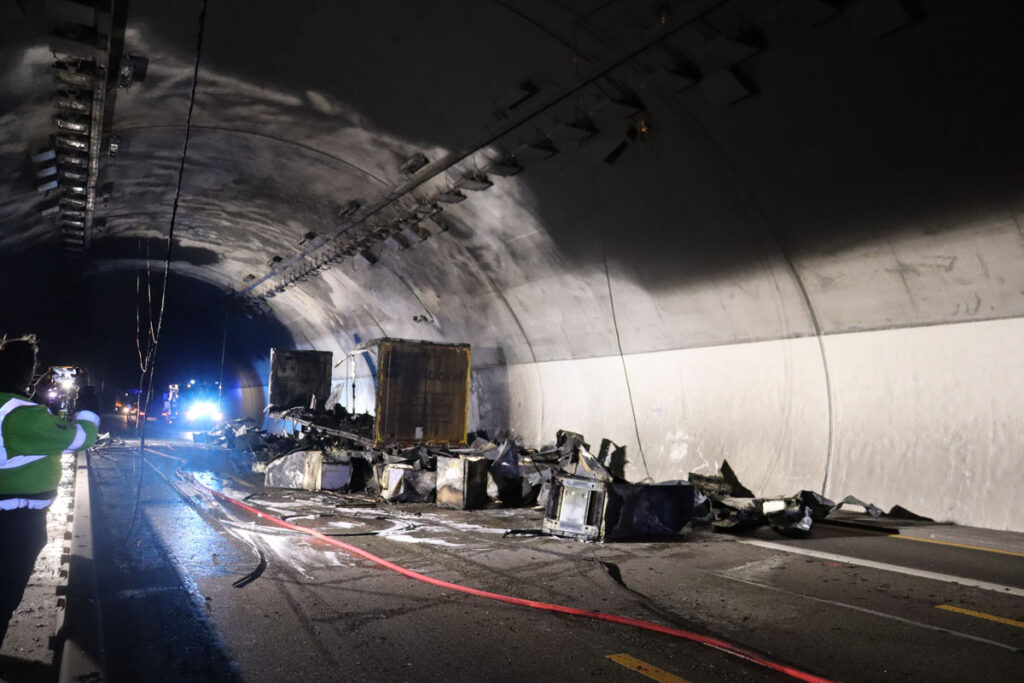 Hilfsorganisationen in den Einsatz entsendet. Der LKW-Auflieger war mit Kühlschränken beladen. Aufgrund der Brandentwicklung sowie starken Rauchentwicklung kam es zu einer erheblichen Gefährdung der Verkehrsteilnehmenden im Tunnel, weshalb ein schnelles Eingreifen der Feuerwehr