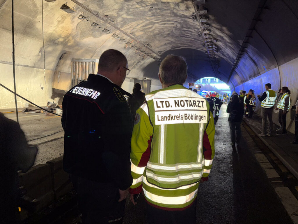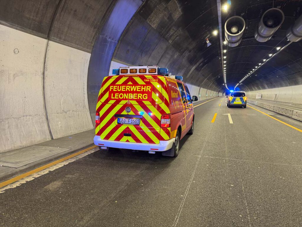 Einsatz. Hier kamen auch ein Radlader sowie Wechselladerfahrzeuge zum Einsatz. Die Weströhre wurde durch den Brand erheblich beschädigt. Die Weströhre bleibt mindestens bei Anfang April gesperrt. Die Röhre Richtung Heilbronn konnte am Mittwochmorgen gegen 5:00 Uhr wieder geöffnet werden. (Stadt Leonberg)