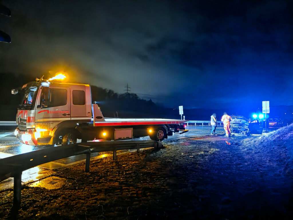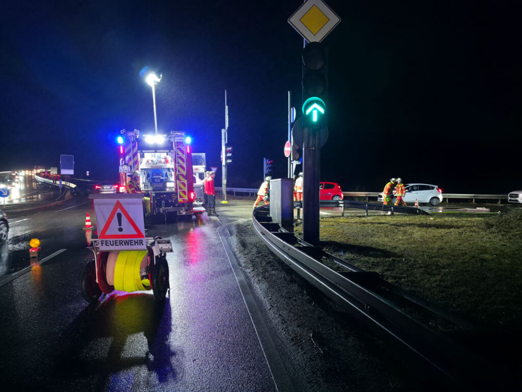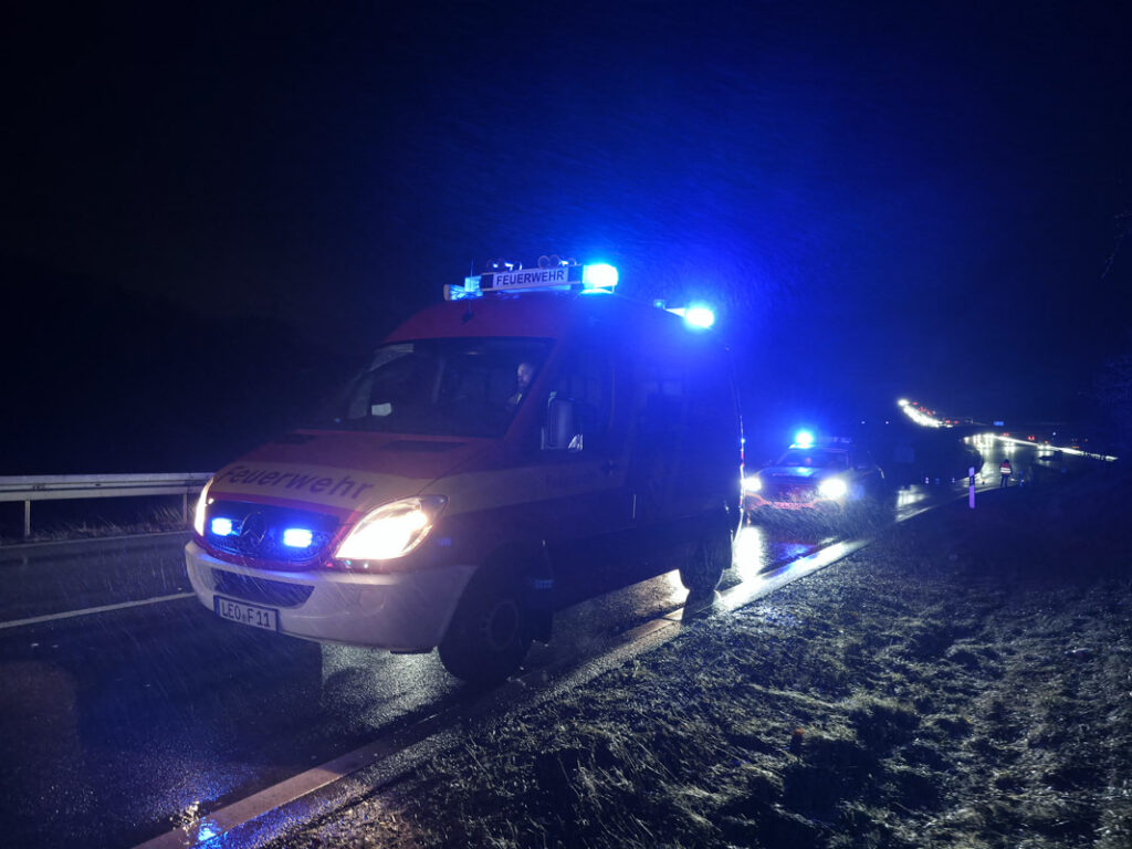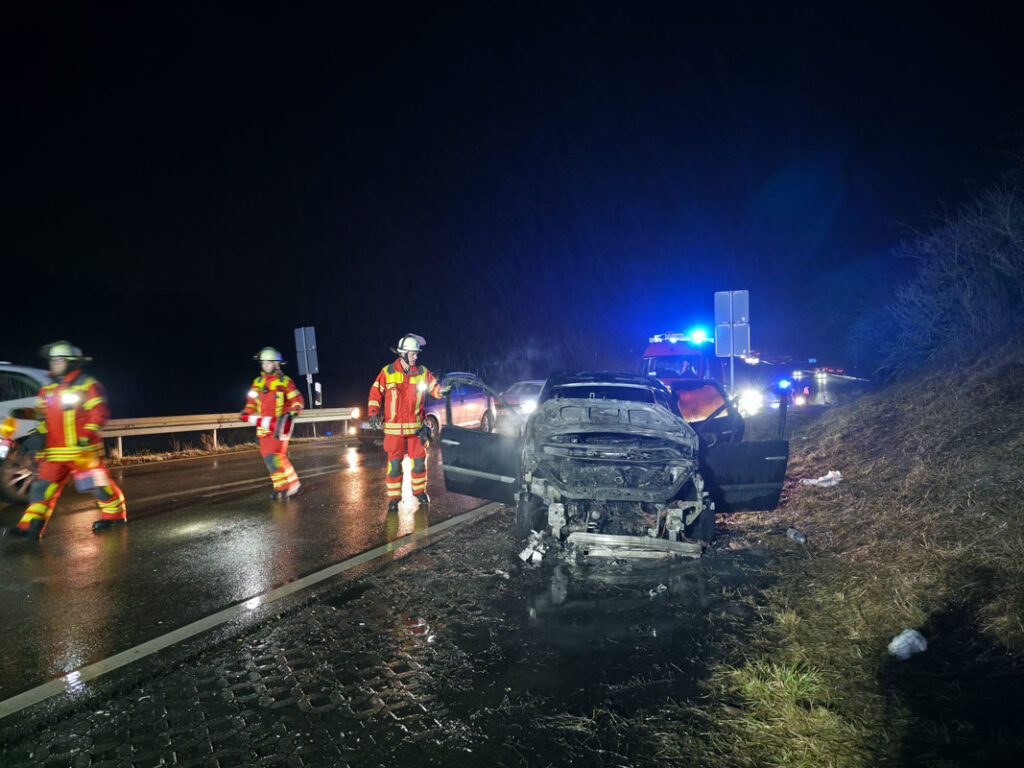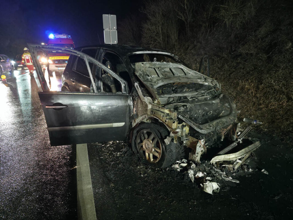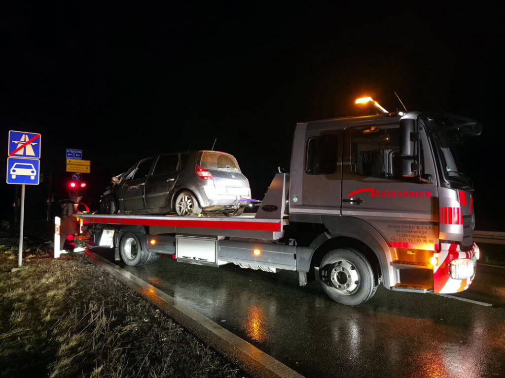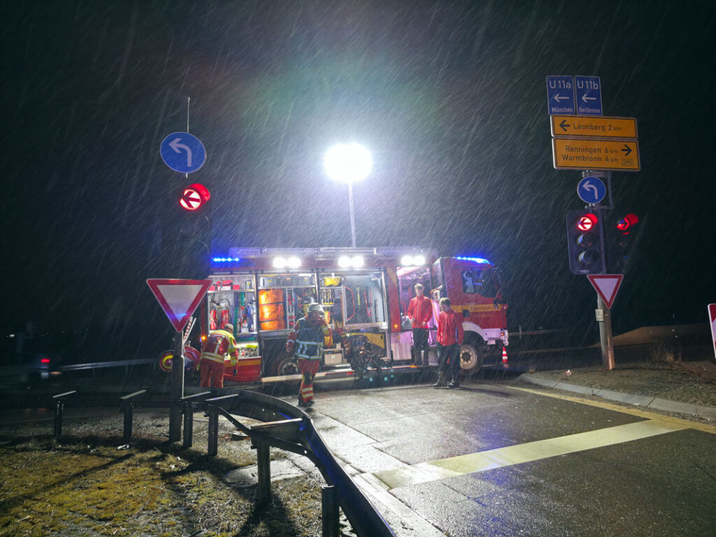 Am Donnerstagabend kam es an der Ausfahrt der Autobahn A8 bei Leonberg-West zu einem PKW-Brand. Der Fahrer eines Fahrzeugs, der auf der A8 aus Richtung Karlsruhe in Richtung Stuttgart unterwegs war, bemerkte kurz vor der Ausfahrt ungewöhnliche Motorgeräusche. Wenig später nahm er im Innenraum Brandgeruch wahr.Der Mann reagierte geistesgegenwärtig, verließ noch die Autobahn und stellte seinen Wagen im Grünstreifen der Ausfahrt ab. Als er den Motorraum öffnete, drang bereits dichter Rauch heraus; kurz darauf stand der Motorraum in Vollbrand. Ein eigener Löschversuch mit Wasserflaschen blieb ohne Erfolg.Die alarmierte Feuerwehr Leonberg rückte mit drei Fahrzeugen und 15 Einsatzkräften an und konnte den Brand rasch löschen. Der PKW war nach dem Feuer nicht mehr fahrbereit und musste abgeschleppt werden.Für die Dauer des Einsatzes mussten die Ausfahrtsspur in Richtung Leonberg sowie eine der beiden Geradeausspuren in Richtung Renningen im Bereich der Anschlussstelle Leonberg-West vollständig gesperrt werden. Der Fahrer des Fahrzeugs blieb bei dem Brand unverletzt. (red)