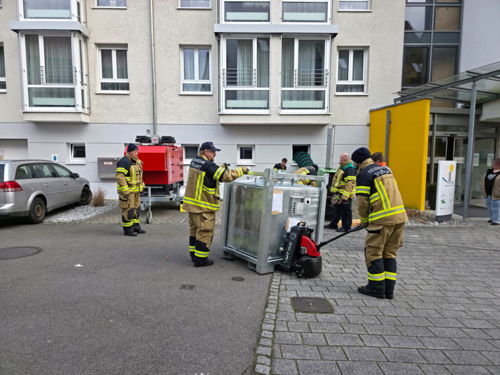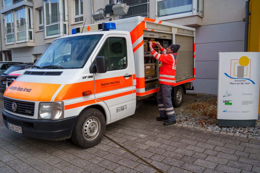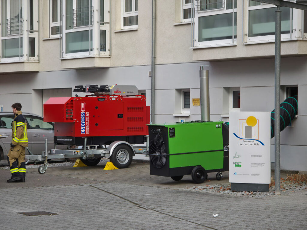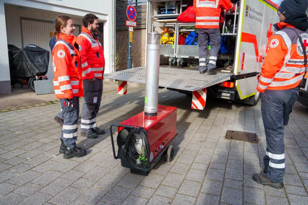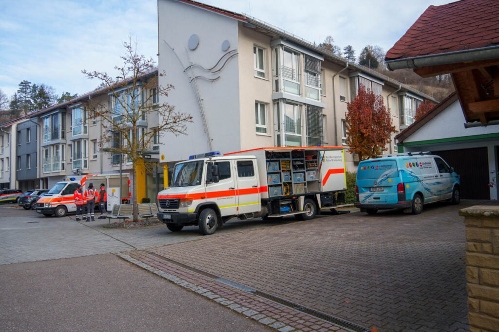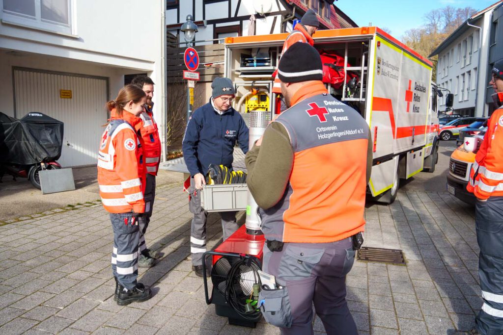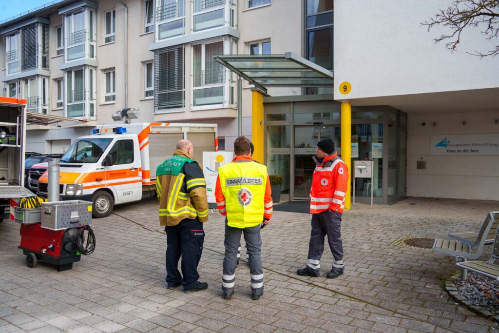 Gegen 8:30 Uhr wurde deshalb der DRK-Ortsverein Waldenbuch alarmiert. Die Helfer verschafften sich rasch einen Überblick über die Lage und stellten fest, dass eine sofortige Übergangslösung zur Wärmeversorgung erforderlich war. Auch der dritte Bürgermeister Waldenbuchs, Ferdinando Puccinelli, war vor Ort und informierte darüber, dass seit dem Vormittag zwei sogenannte „Leistungsmodule“ im Einsatz seien – besetzt mit Kräften aus Holzgerlingen, vom DRK Böblingen sowie vom DRK Waldenbuch.
