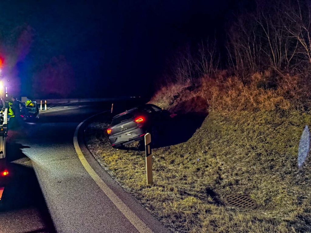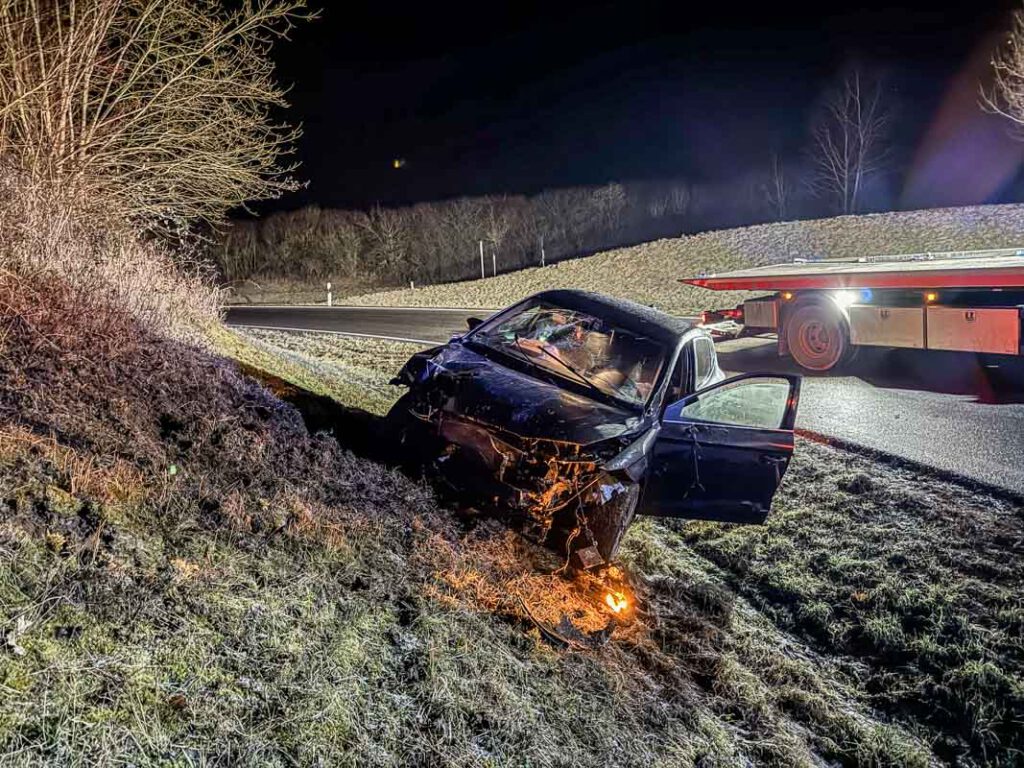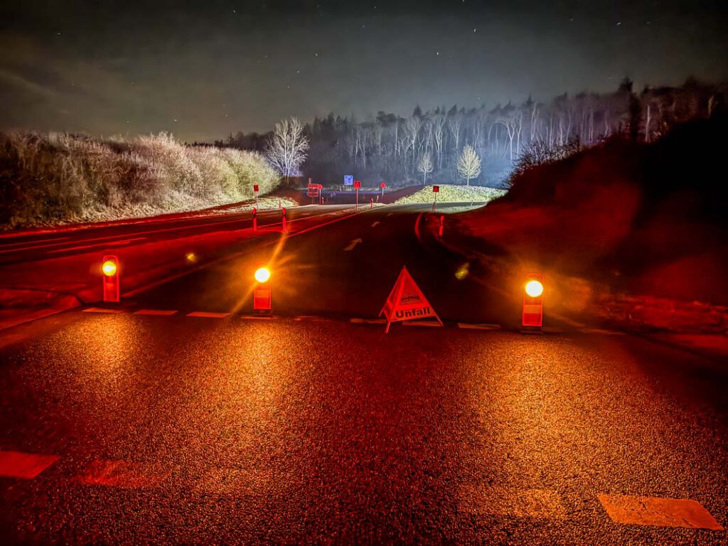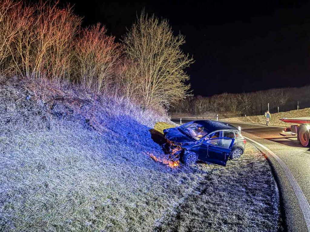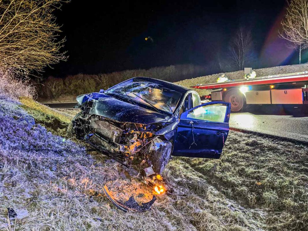 Mit schweren Verletzungen wurde ein 40 Jahre alter Seat-Lenker am Mittwoch (21.01.2026) vom Rettungsdienst in ein Krankenhaus gebracht, nachdem er gegen 22.40 Uhr in einen Verkehrsunfall auf der Bundesautobahn 8 verwickelt war. Der 40-Jährige war in Richtung München unterwegs, als er aus noch ungeklärter Ursache auf Höhe der Anschlussstelle Rutesheim nach rechts von der Fahrbahn abkam. Nach dem er mit mehreren Verkehrszeichen kollidiert war, schanzte er etwa 50 Meter über einen Hügel, der Auf- und Abfahrt voneinander trennt. Dort schlug der Seat auf der Fahrbahn der Auffahrt auf und schleuderte schließlich eine Böschung hinauf.